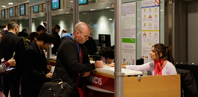 MWC — очень крупная выставка, огромное количество участников, журналистов и любителей простояли бы в очереди весь первый день. Для того чтобы не задерживать проход и успешно зарегистрировать всех вовремя и без лишней спешки, были организованы специальные пункты в основных местах обитания приехавших в Барселону гостей. Так например стойки регистрации по 15 окон были в каждом терминале аэропорта — приехав вы имеете возможность на месте получить все необходимое для прохода в первый день.