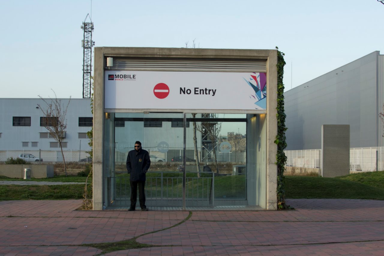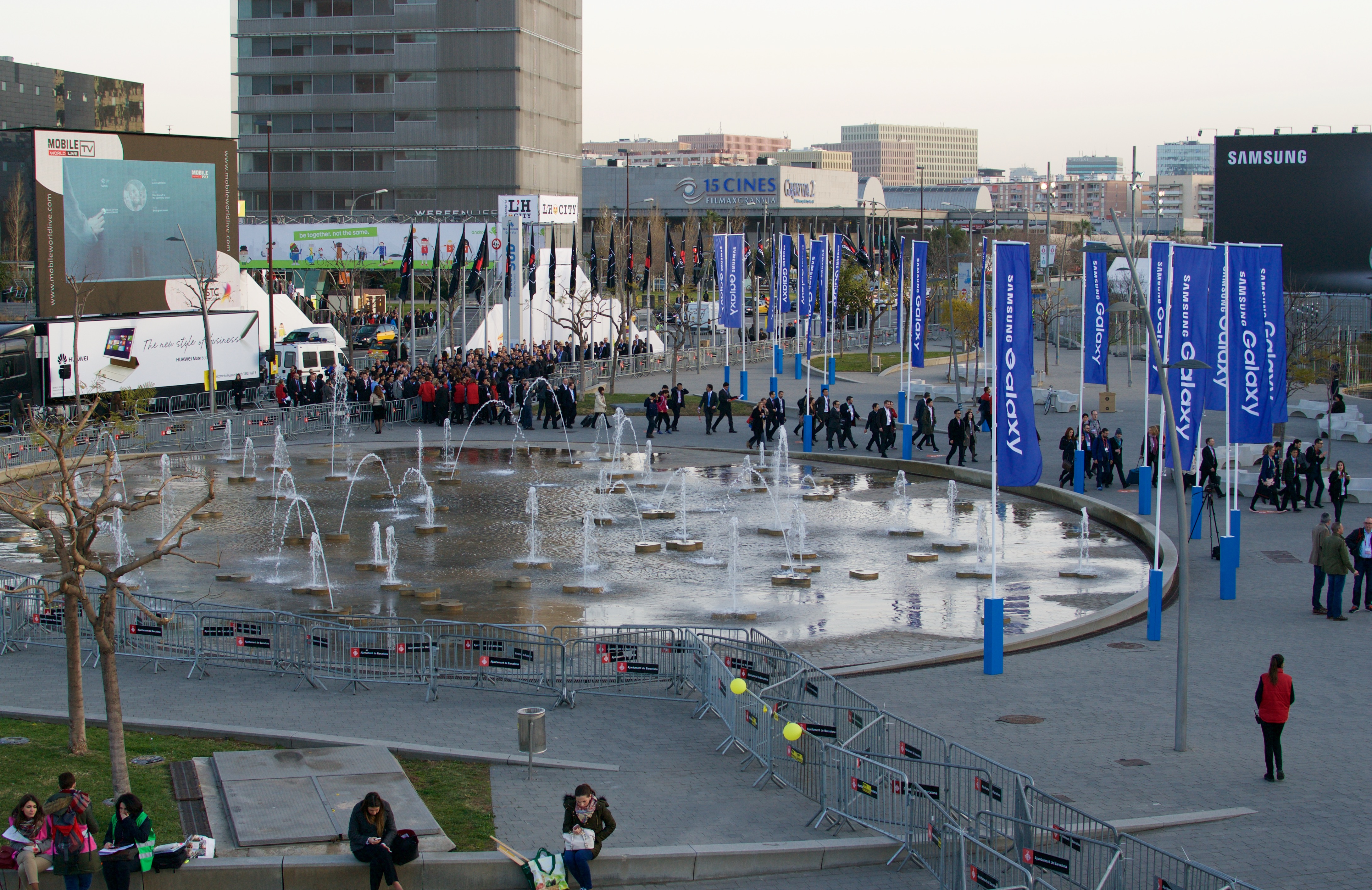 На время MWC над пешеходными переходами были организованы специальные мосты — не нужно ждать довольно долгого светофора, воспользуйтесь мостом. В часы пик, утром и в обеденный перерыв на переходах вокруг выставки дежурили полицейские, регулируя переход и проезд в зависимости от требований и дорожной обстановки.
