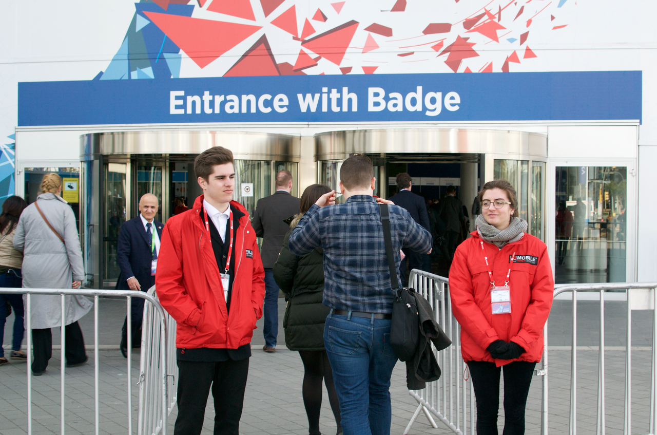 Для прохода на выставку нужно иметь при себе свой бейдж, без него дальше вам не пройти. Вход для посетителей разделен — для пользователей приложения MWC с Digital Badge, загрузивших своё фото в него и для желающих пройти по старинке с паспортом или другим документом с фото. Понятное дело это занимает разное количество времени.