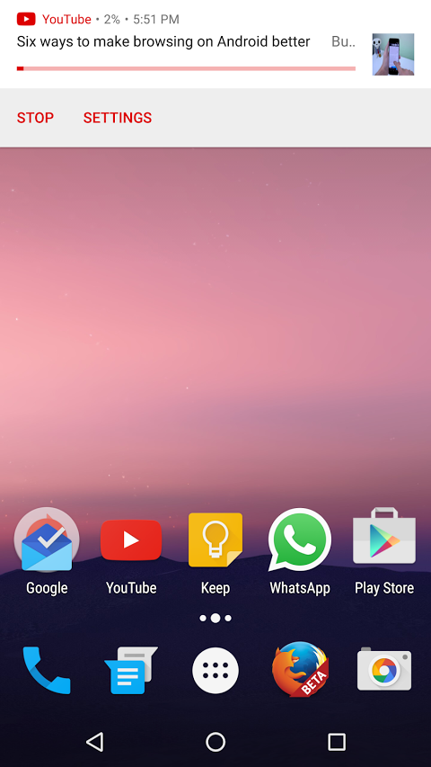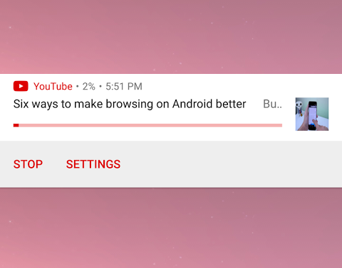 Для появления функции в приложении необходимо очистить данные программы YouTube в настройках. Возможно, что это нововведение тестируется только на пользователях превью-версии Android N. Так или иначе, при включенной фоновой буферизации можно поставить видео на паузу и свернуть приложение, после чего в «шторке» уведомлений появится соответствующая панель от программы YouTube, где показывается подгрузка ролика в процентах. Буферизацию можно остановить прямо из этого уведомления, если пользователь не хочет тратить трафик.