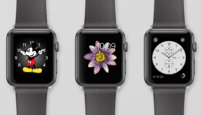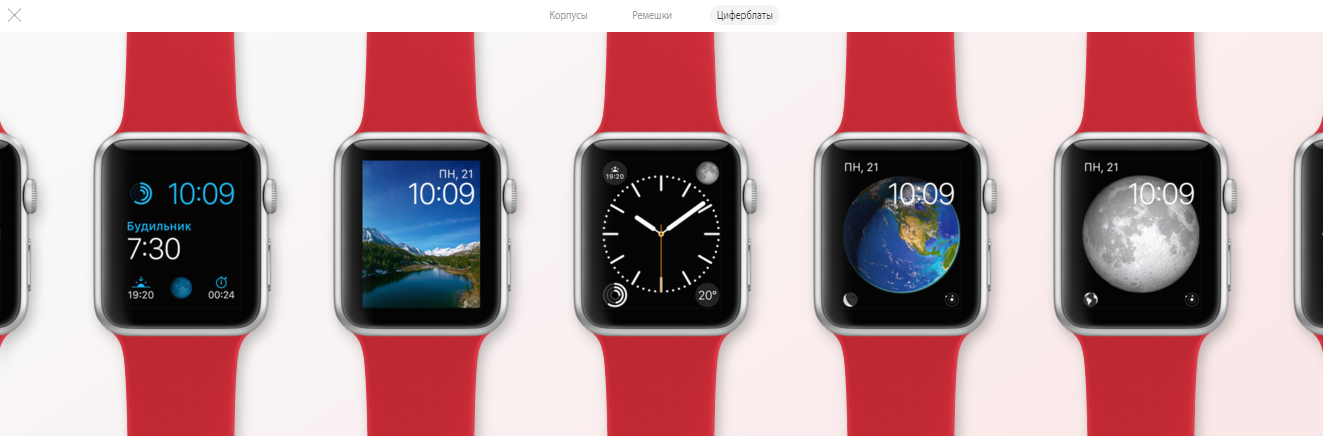 С помощью новой утилиты на сайте Apple у часов можно выбрать размер корпуса (38 и 42 мм), материал и цвет (нержавеющая сталь или алюминий), а также подобрать нужный ремешок, а еще ради интереса посмотреть, как выглядят циферблаты на экране Apple Watch. Интерфейс утилиты выполнен в простом стиле «рулетки» — варианты корпусов, ремешков и циферблатов горизонтально прокручиваются.
